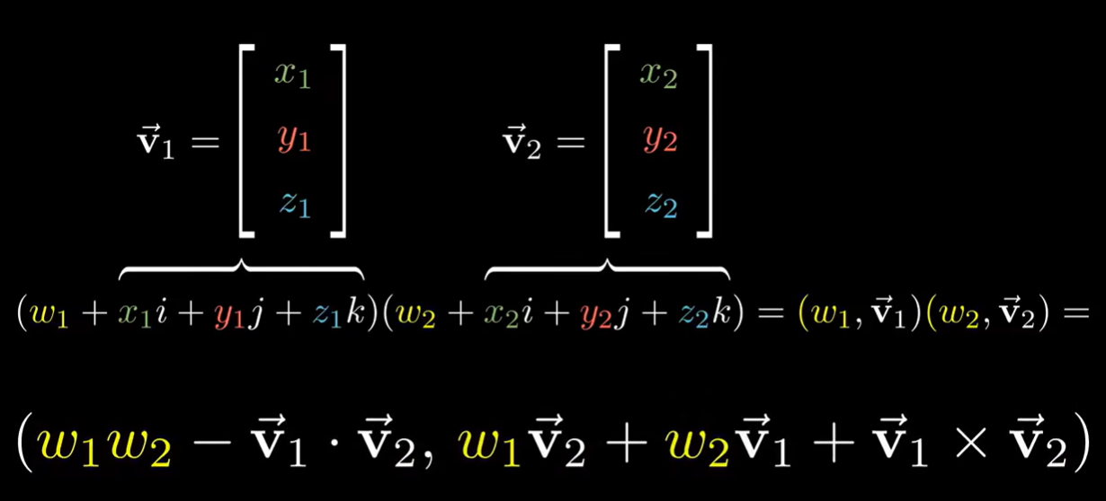 注意到,向量其实是实部为 0 的四元数 向量叉乘是四元数乘法的一部分: 等式右侧就是三阶行列式公式