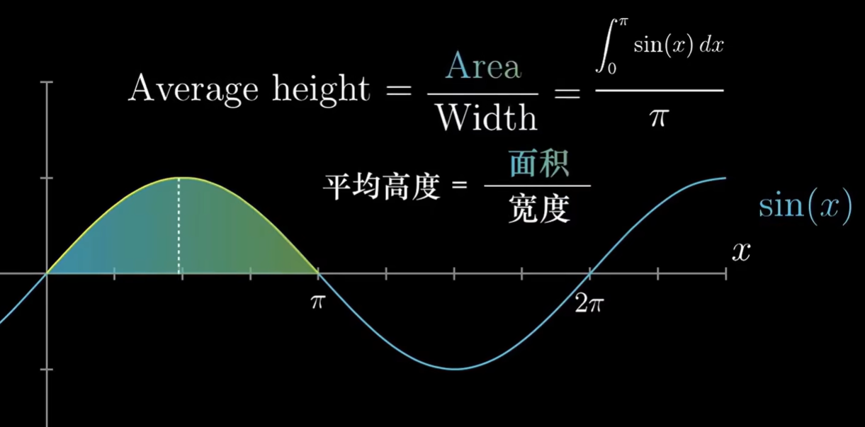 • 求连续函数某一区间的平均值 具有实际意义,比如说通过温度变化曲线图求半年内的平均气温\begin{align}平均高度 & = 高度和/点的数量 \\ & = 高度和 / (区间宽度 / dx) \\ & = (高度和 \times dx) / 区间宽度 \end{align}公式右侧即原函数两点间斜率,即可以通过积分求得区间内平均切线斜率