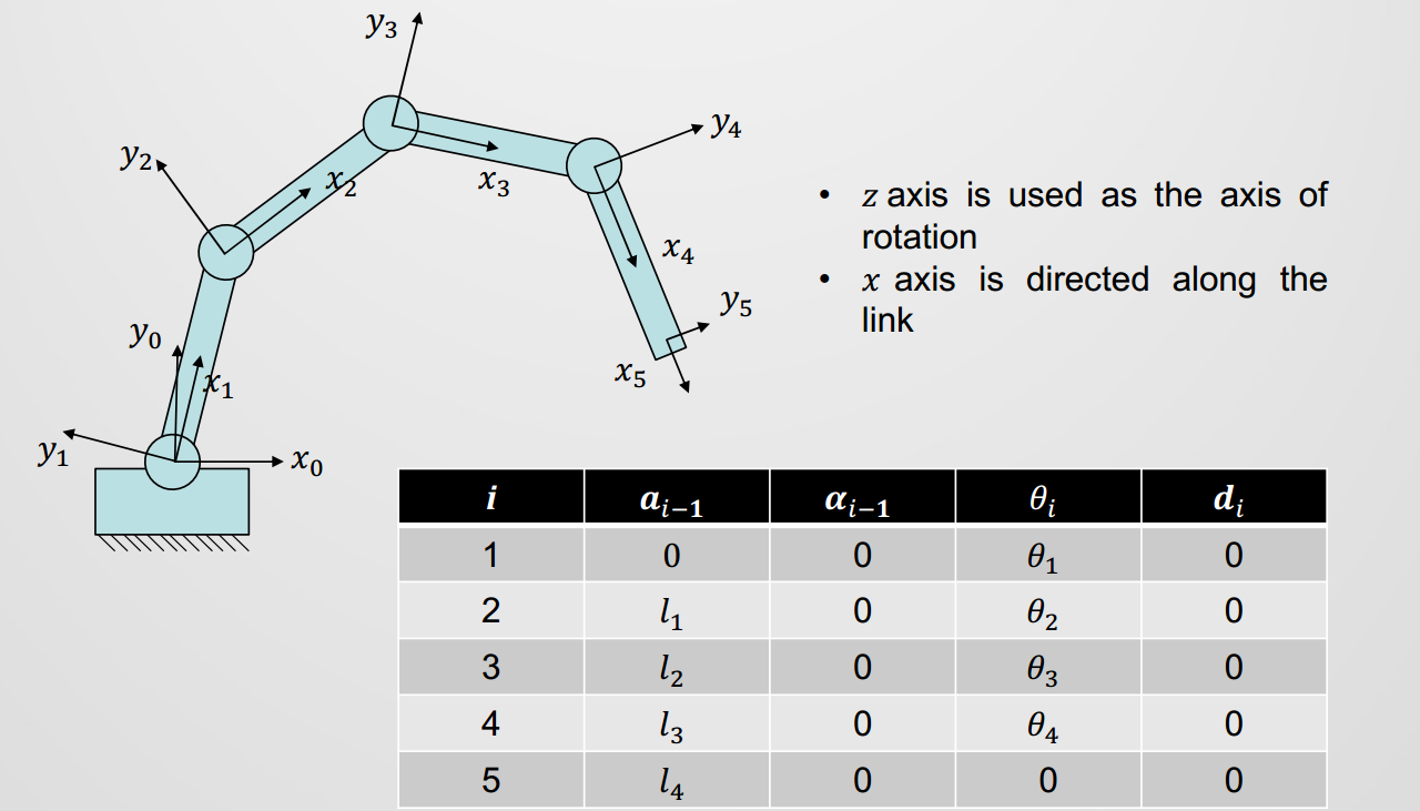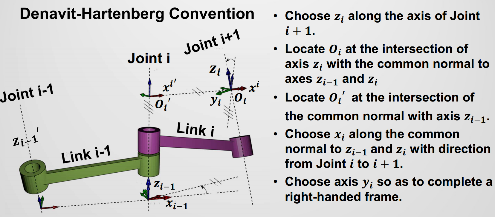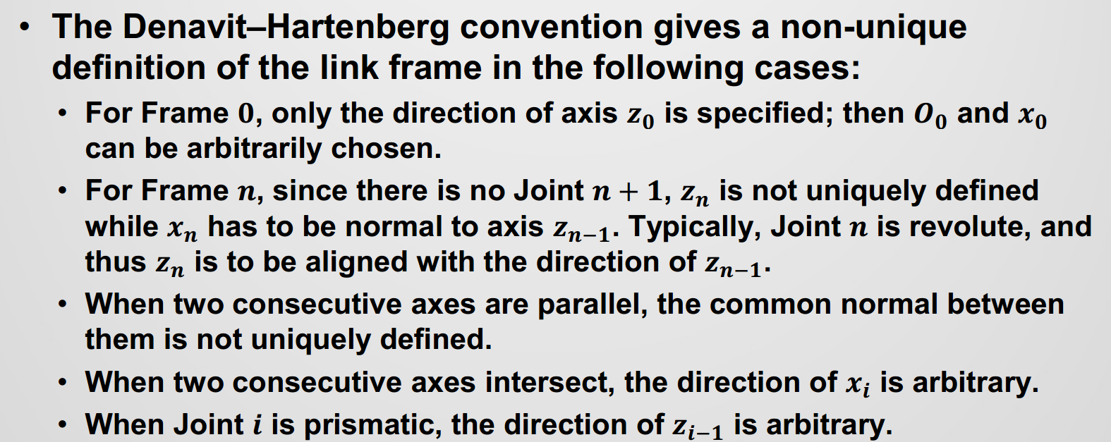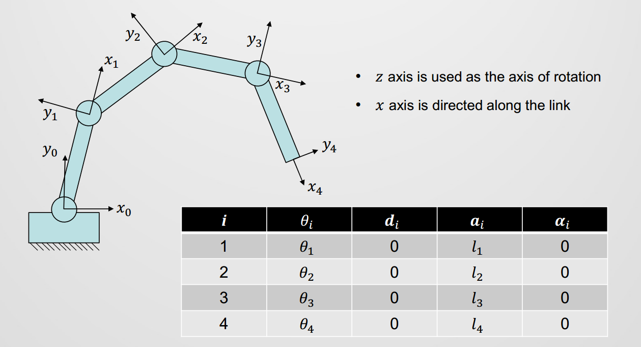 - D-H 方法通过一套严格的规则解决了这个问题,确保每个相邻坐标系之间的变换都可以用仅有的 4 个参数 来表示。