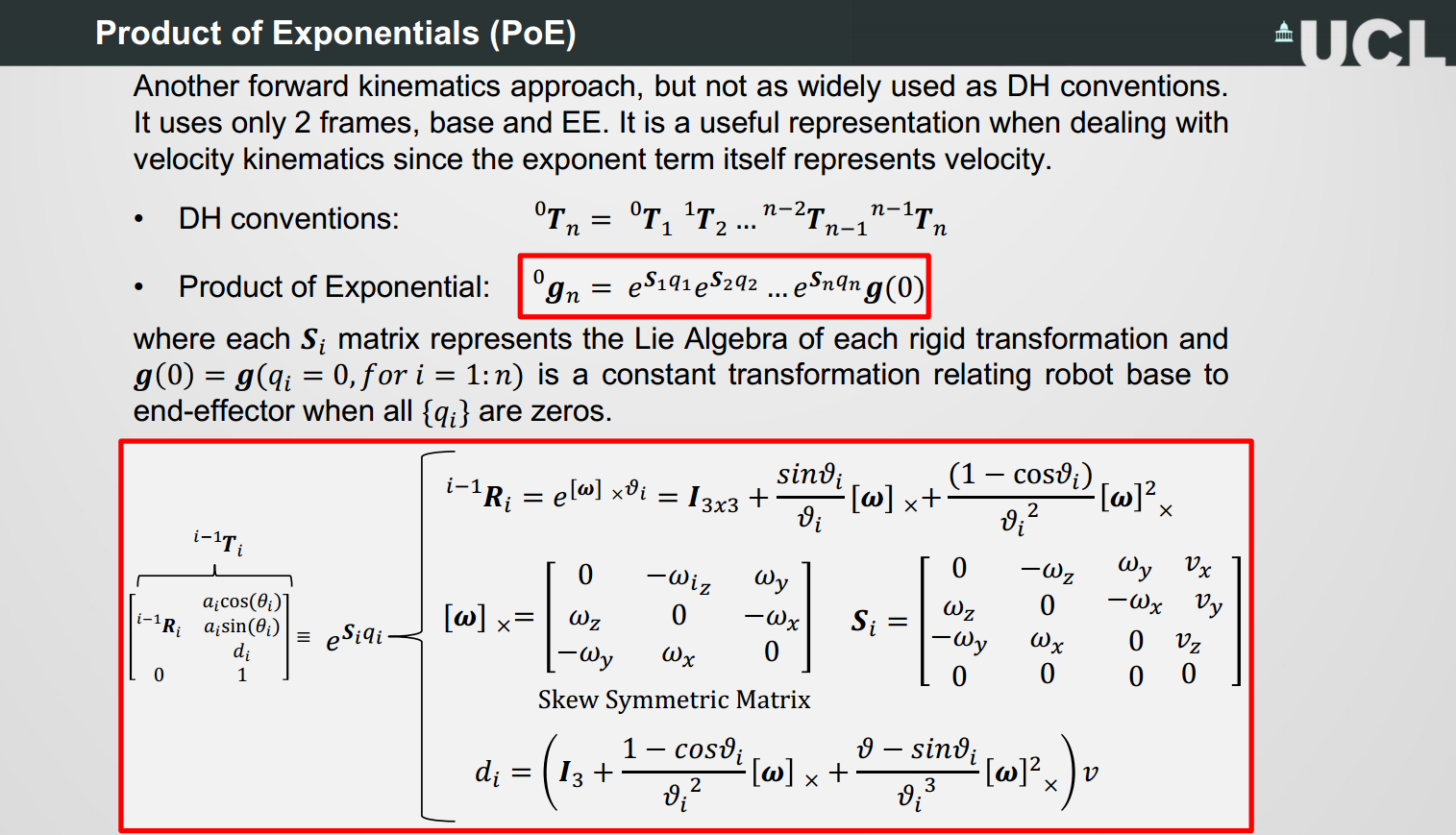 - 运动链视为一系列刚体运动的“指数”相乘:将机器人从基座到末端的整体变换,表示为各个关节运动(以指数形式表示)的乘积。