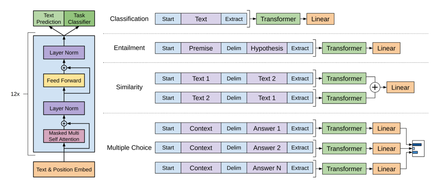 - 系统性地验证了预训练-微调范式(基于 Transformer 解码器)在 NLP 领域的有效性