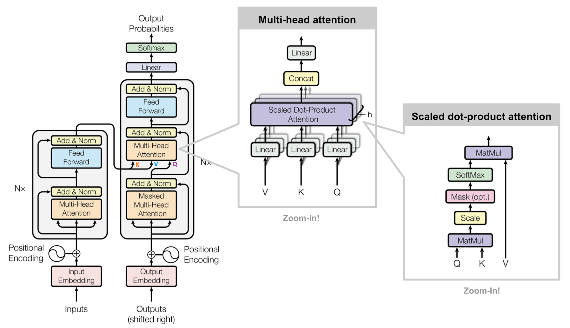 - 核心是注意力机制,之后是位置编码;此外只有前馈层、输出层、Norm 等功能层,Norm 优化方法可以注意