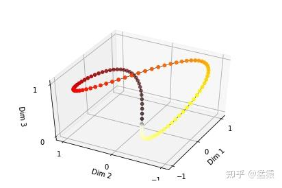 由于 sin 是周期函数,因此从纵向来看,如果函数的频率偏大,引起波长偏短,则不同 t 下的位置向量可能出现重合的情况。比如在下图中 (d_model = 3),图中的点表示每个 token 的位置向量,颜色越深,token 的位置越往后,在频率偏大的情况下,位置向量点连成了一个闭环,靠前位置(黄色)和靠后位置(棕黑色)竟然靠得非常近:
