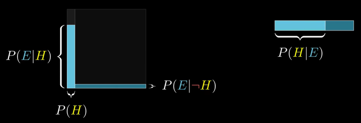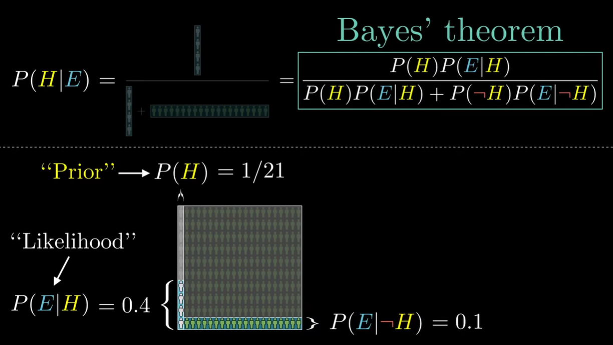 - @ 公式:P(H∣E)=P(E)P(H)⋅P(E∣H)=P(H)P(E∣H)+P(¬H)P(E∣¬H)P(H)⋅P(E∣H)