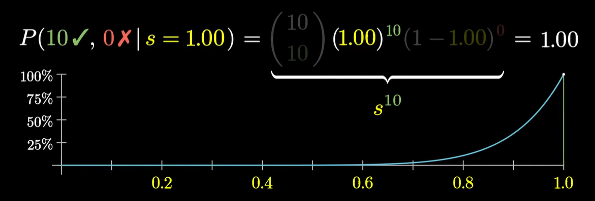- ~ 计算:P(data∣s)=c⋅s#✓(1−s)#✘;其中 c 为组合数,比如说 C108*